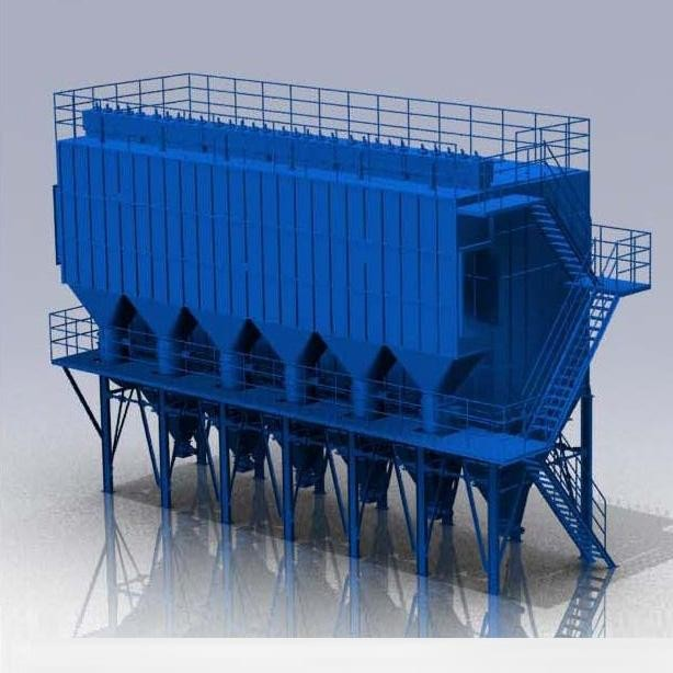低壓脈沖袋式除塵器的氣體凈化方式為外濾器。含塵氣體從導向管進入各單元過濾室。在設計中,由于濾袋底部與進氣口上部有足夠的垂直距離,通過適當的導流和自然流動方向,合理的氣流分布可以在整個過濾室內實現均勻的氣流分布。含塵氣體中的粉塵顆粒經自然沉降分離后直接落入灰斗內,其馀的粉塵在導流系統的引導下直接落在灰斗中。隨著空氣的流動進入過濾區的中間箱,吸附在過濾袋的外表面。過濾干凈的氣體通過過濾袋通過上箱,排氣管排出。