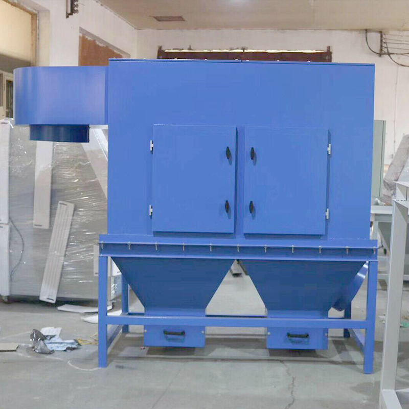 含塵氣體進入箱體內,由扁布袋過濾器進行過濾,粉塵被阻留在濾袋外表面,已凈化的氣體通過濾袋進入風機,由風機吸入直接排出,隨著過濾時間的增加,濾袋外面粘附的粉塵也不斷增加,濾袋阻力也相應增大,從而影響了除塵效率,此時啟動振打機構使粘附在濾袋表面的粉塵抖落下來,落在抽屜中的粉塵由人工拉出。